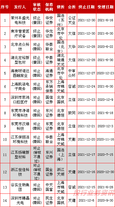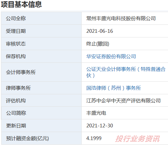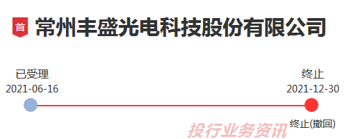 2021年12月23日,常州丰盛光电科技股份有限公司申请撤回发行上市申请文件。根据《深圳证券交易所创业板股票发行上市审核规则》第六十七条,深交所决定终止对其首次公开发行股票并在创业板上市的审核。
