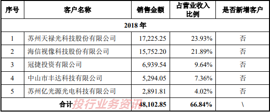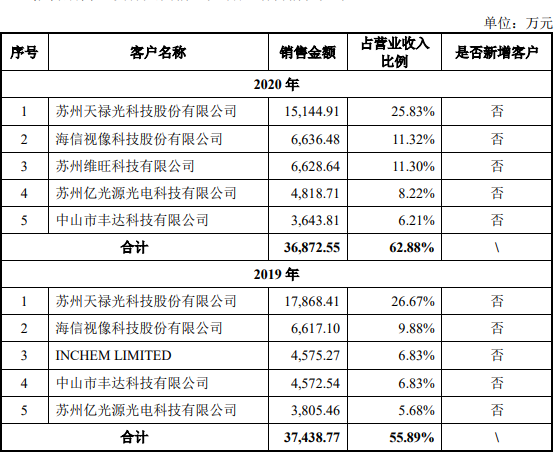 报告期内各期公司向前五名客户的销售金额分别为 48,102.85 万元、37,438.77 万元和 36,872.55 万元,占营业收入的比例分别为 66.84%、55.89%和62.88%,占比较高。公司直接下游企业主要是板材加工厂商,和液晶显示器、LED液晶电视背光模组生产厂商,其实力强、规模大、信誉良好,且面向的终端客户也都是全球液晶面板行业顶尖企业。全球液晶面板行业集中度较高,京东方、三星、LGD 等少数行业巨头每年的液晶面板出货量居行业前列,对导光板的需求量也最大,促成了本公司对其销售的集中。出于规模采购降低成本、管控质量等方面的考虑,终端品牌厂商及产业链供应商在确定其上游企业后,通常会维持较长时间的稳定合作关系。若出现行业景气度下降等因素而导致的主要客户采购量下降,或公司主要客户的生产经营及财务状况出现恶化,将直接影响到公司的业务经营,对公司的业绩产生不利影响。