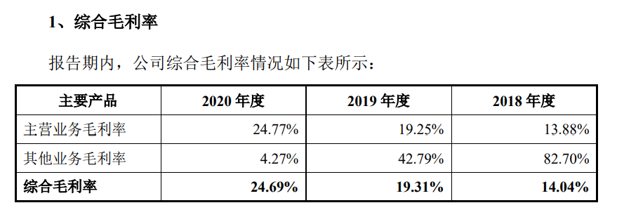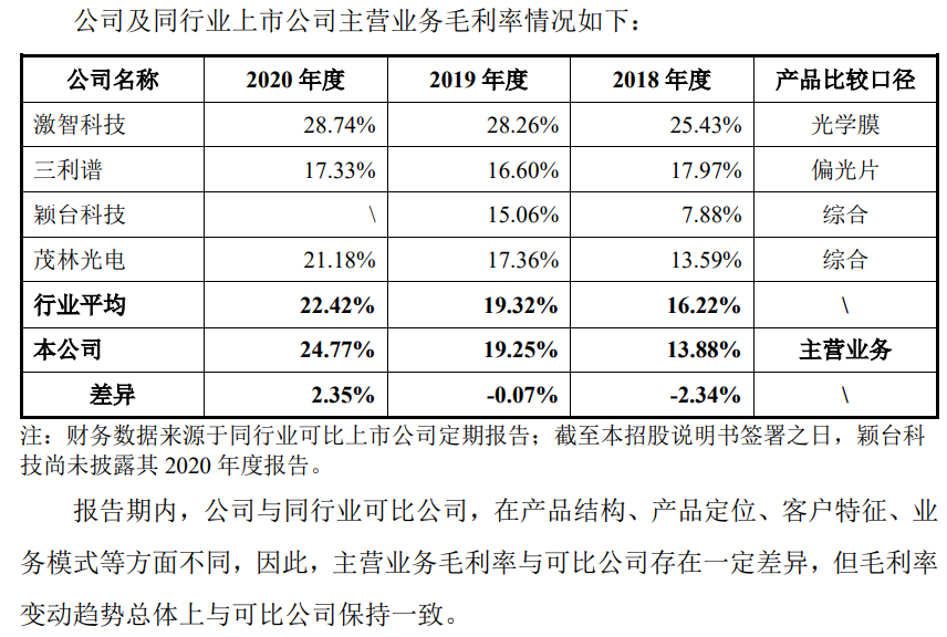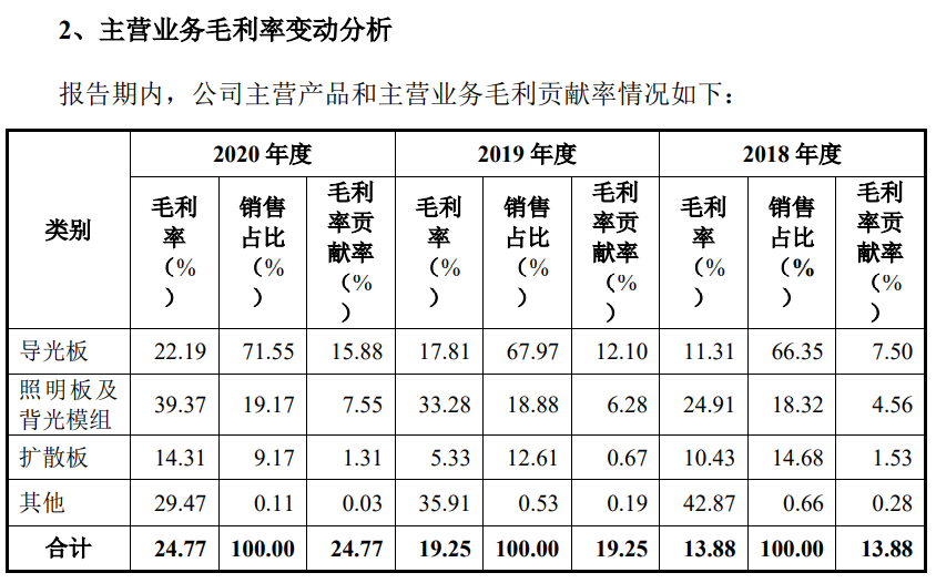 报告期内,公司综合毛利率分别为 14.04%、19.31%和 24.69%,呈大幅快速攀升趋势,公司毛利率从报告期初低于行业平均水平变为高于行业平均水平。报告期内,公司主营业务毛利率分别为 13.88%、19.25%和 24.77%。其中, 导光板作为公司核心产品,是公司收入和利润的主要来源。