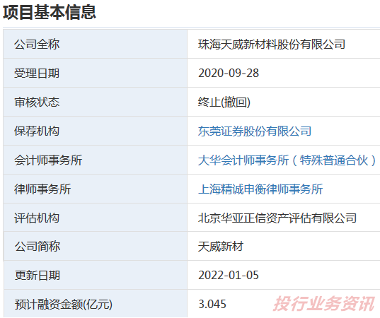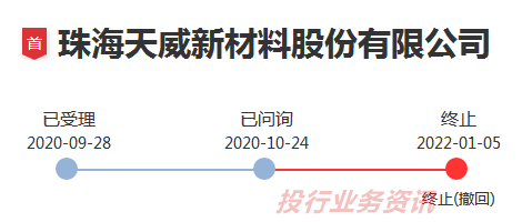 2021年12月30日,珠海天威新材料股份有限公司申请撤回发行上市申请文件。根据《深圳证券交易所创业板股票发行上市审核规则》第六十七条,深交所决定终止对其首次公开发行股票并在创业板上市的审核。