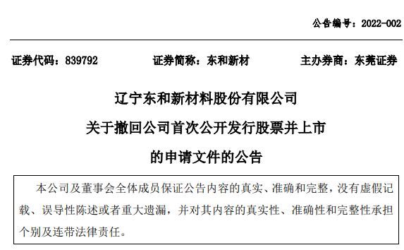 新三板公司东和新材1月20日披露,公司基于上市战略调整等因素考虑,经与保荐机构深入沟通,研究决定撤回上市申请文件,即终止本次首次公开发行股票并在创业板上市的申请。公司董事会已审议通过了《关于撤回公司首次公开发行股票并上市申请文件》议案,向深交所申请撤回首次公开发行股票并上市申请文件。