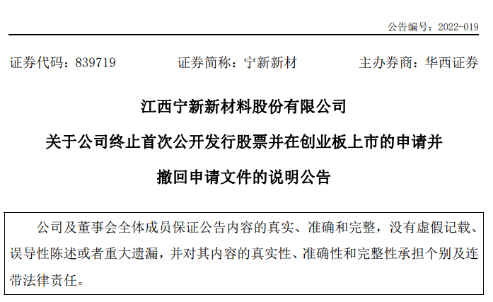 2021年4月1日,因宁新新材的签字保荐代表人被中国证监会依法采取暂不受理与行政许可有关的文件的监管措施,尚未解除,根据《深圳证券交易所创业板股票发行上市审核规则》第六十四条的相关规定,本所中止其发行上市审核。