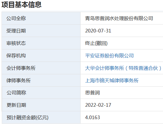 经过4轮的问询与反馈,7版招股书披露!2022年2月10日,青岛思普润水处理股份有限公司申请撤回发行上市申请文件。根据《深圳证券交易所创业板股票发行上市审核规则》第六十七条,深交所决定终止对其首次公开发行股票并在创业板上市的审核。
