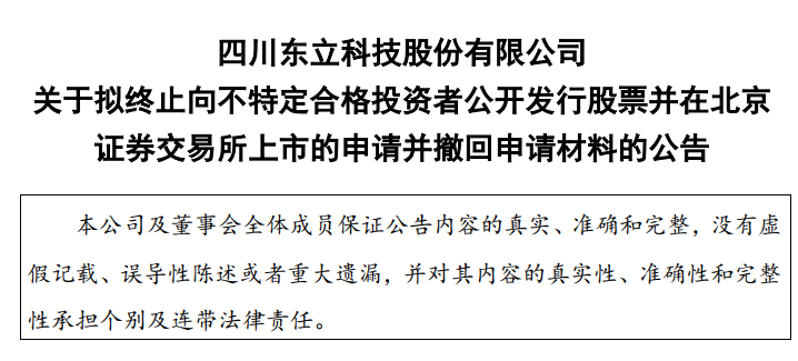 2022年3月7日四川东立科技股份有限公司发布关于拟终止向不特定合格投资者公开发行股票并在北京证券交易所上市的申请并撤回申请材料的公告。