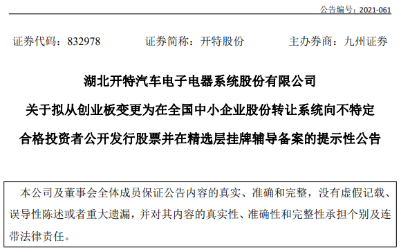 现公司根据自身发展战略需要进行综合考量,拟将首次公开发行股票并在创业板上市的计划变更为在全国中小企业股份转让系统向不特定合格投资者公开发行股票并在精选层挂牌。经与九州证券沟通,双方于 2021 年 9 月 10 日签署了《提前终止合同协议书》,终止了《湖北开特汽车电子电器系统股份有限公司与九州证券股份有限公司关于湖北开特汽车电子电器系统股份有限公司首次公开发行股票之辅导协议》,并于同日签署了《湖北开特汽车电子电器系统股份有限公司与九州证券股份有限公司关于湖北开特汽车电子电器系统股份有限公司向不特定合格投资者公开发行并在精选层挂牌之辅导协议》,且于同日向湖北监管局提交了变更上市辅导备案板块的申请。