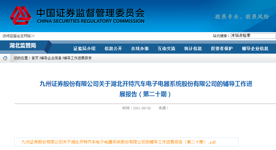 湖北开特汽车电子电器系统股份有限公司(以下简称“公司”)于 2018 年1 月 18 日与九州证券股份有限公司(以下简称“九州证券”或“辅导机构”)签署了《湖北开特汽车电子电器系统股份有限公司与九州证券股份有限公司关于湖北开特汽车电子电器系统股份有限公司首次公开发行股票之辅导协议》,于同日得到中国证券监督管理委员会湖北监管局(以下简称“湖北监管局”)确认,进入首次公开发行股票并在创业板上市辅导期。