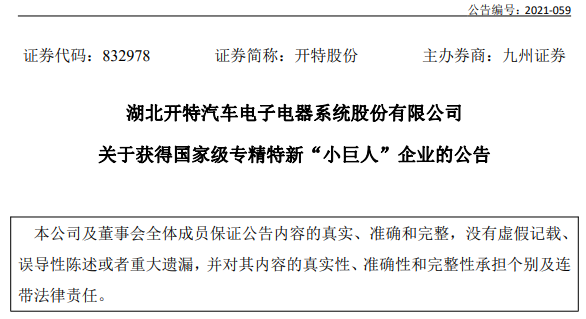 根据湖北省经济和信息化厅于近日公布的《湖北省获国家级专精特新“小巨人”企业名单》,湖北开特汽车电子电器系统股份有限公司(以下简称“公司”)获得国家级专精特新“小巨人”企业(第三批)。