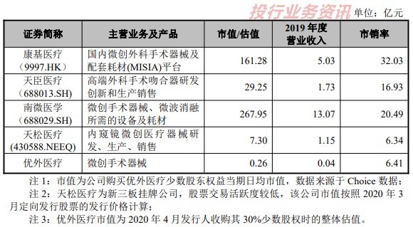 优外医疗的主要产品为微创手术器械,该细分行业企业具有资产规模较小、盈利能力和成长性较好的特点。同行业可比上市公司业务相对成熟、盈利能力较强、股票成交活跃,整体估值水平较高;新三板挂牌公司天松医疗所处行业、主要产品与优外医疗相似,有较强的可比性,优外医疗并购时点(2020 年 4 月)的评估值、按照天松医疗定向发行股票(2020 年 3 月)的发行价格计算其整体估值,并据此计算的市销率两者较为接近。