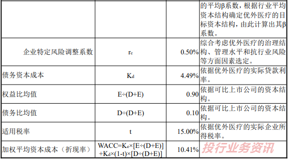 根据前述参数的选取结果,按照加权平均资本成本(折现率)计算公式计算得出本次采用现金流量法进行评估的折现率水平为 10.41%,符合估值基准日的外部风险环境以及优外医疗自身经营情况,具有合理性。