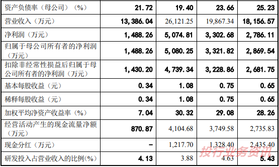 报告期内,公司营业收入分别为18,156.57万元、19,867.34万元、26,121.25万元和 13,386.04 万元,归母净利润分别为 2,869.54 万元、3,321.82 万元、5,080.25万元和1,488.26万元。