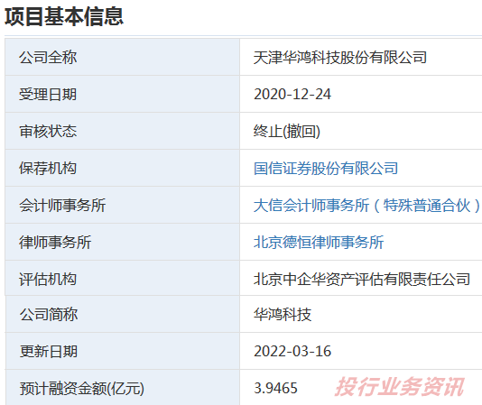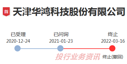 2022年3月14日,天津华鸿科技股份有限公司申请撤回发行上市申请文件,深交所决定终止对其首次公开发行股票并在创业板上市的审核。