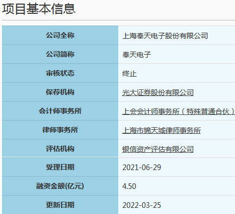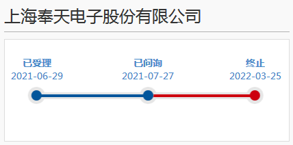 2022年03月24日,上海奉天电子股份有限公司因发行人撤回发行上市申请或者保荐人撤销保荐,上交所终止其发行上市审核。