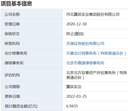 2022年3月22日,河北翼辰实业集团股份有限公司申请撤回发行上市申请文件,深交所决定终止对其首次公开发行股票并在创业板上市的审核。