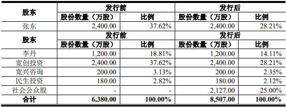 公司控股股东、实际控制人为张东、李丹夫妇。截至本招股说明书签署日,张东先生直接持有公司 2,400 万股,其配偶李丹女士直接持有公司 1,200 万股,张东、李丹夫妇合计直接持有公司 56.43%股份。同时,张东、李丹夫妇通过宽创投资、宽兴咨询合计间接控制公司 40.75%的股份。张东、李丹夫妇合计控制公司 97.18%的股份。