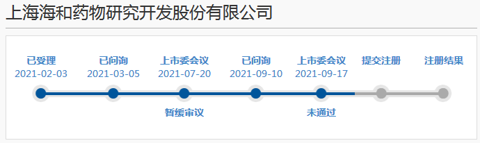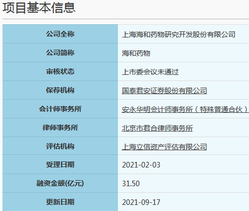 上海证券交易所科创板上市委员会 2021年第 70次审议会议于 2021 年 9 月 17 日上午召开,上海海和药物研究开发股份有限公司(首发)审议结果:不符合发行条件、上市条件和信息披露要求。