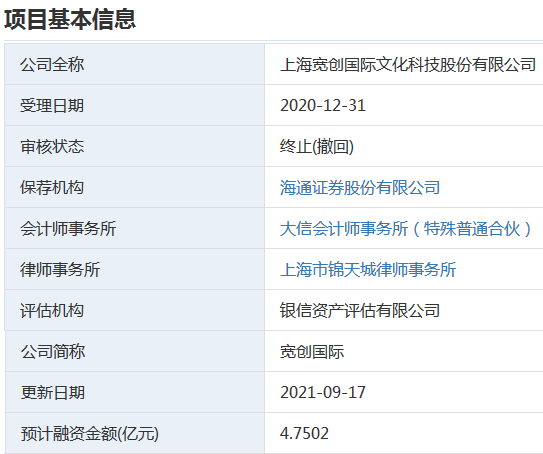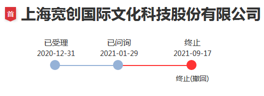 2021年9月16日,上海宽创国际文化科技股份有限公司申请撤回发行上市申请文件,深交所决定终止对其首次公开发行股票并在创业板上市的审核。