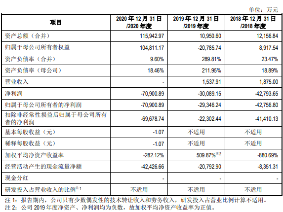 2018 年、2019 年和 2020 年,公司归属于母公司股东的净利润分别为42,756.80 万元、-29,346.24 万和-70,900.89 万元。截至 2020 年 12 月 31 日,公司累计未分配利润为-75,452.81 万元。上述情况主要是由于公司目前仍无产品进入商业化阶段,尚未形成产品销售收入,但新药研发需要大量持续的研发投入,由此导致公司亏损并存在大额累计未弥补亏损。