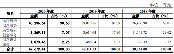公司馆厅展示创意服务业务收入占比最大且逐年上升,单个项目合同金额较大;公司展览展示创意服务业务的项目数量多但单个合同金额小,收入占比较小且逐年降低。创意设计服务是公司向客户仅提供设计方案,收入占比较低,无一贯性。