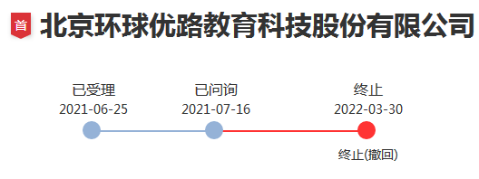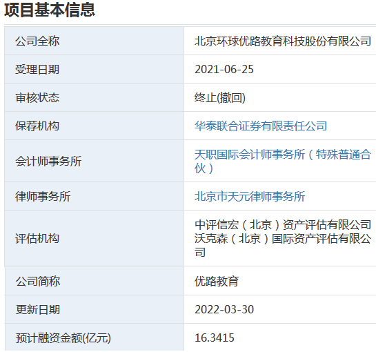 2022年3月29日,北京环球优路教育科技股份有限公司申请撤回发行上市申请文件。根据《深圳证券交易所创业板股票发行上市审核规则》第六十七条,深交所决定终止对其首次公开发行股票并在创业板上市的审核。