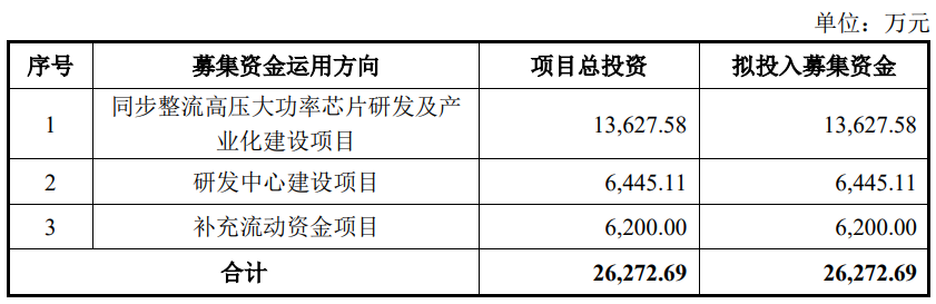 根据招股说明书,本次募集资金合计 26,272.69 万元,同步整流高压大功率 芯片研发及产业化建设项目和研发中心建设项目均将在两年内建设完成,募集资金用于同步整流高压大功率芯片研发及产业化建设项目 13,627.58 万元、研发中心建设项目 6445.11 万元。
