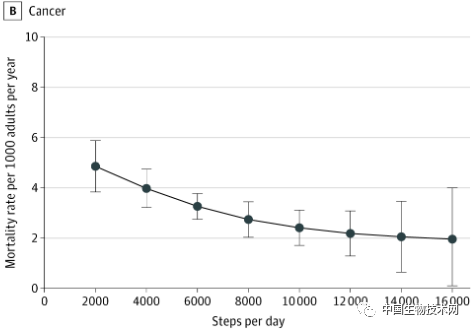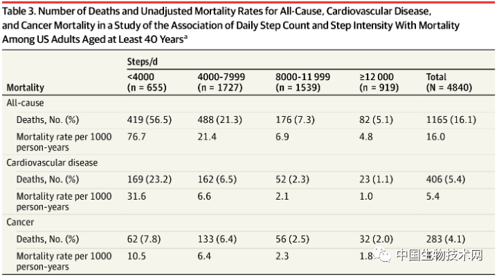 确定死亡率截止到2015年12月,在平均10.1年的随访中,有1165人死亡,其中406人死于心血管疾病,283人死于癌症。在协变量调整后的模型中加入每日步数后,分析结果如下: