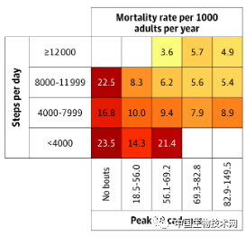 每天走4000步至7999步的1727名参与者中,每年全因死亡率为21.4‰(488人死亡);