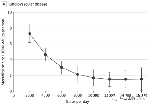 每天走8000-11999步的1539名参与者中,每年全因死亡率为6.9‰(176人死亡);