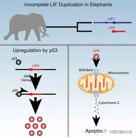 已有研究发现大象自身携带抗癌基因TP53,它所编码产生的P53蛋白可以促进DNA的修复;而当DNA无法修复时,P53蛋白还可以诱导异常细胞“自杀”,防止癌症发生。在人体细胞内,TP53基因只有1对;而在大象的细胞内,这个基因有20对。此外,它们还自带白血病抑制因子6(LIF6)。LIF6与TP53相互配合,当P53蛋白合成时,会激活LIF6,并编码生产一种让细胞“自杀”的蛋白质,这些蛋白质迅速进入受损靶细胞的线粒体,并在线粒体里搞破坏,让受损细胞丧失线粒体的能量供给,最终导致其死亡。