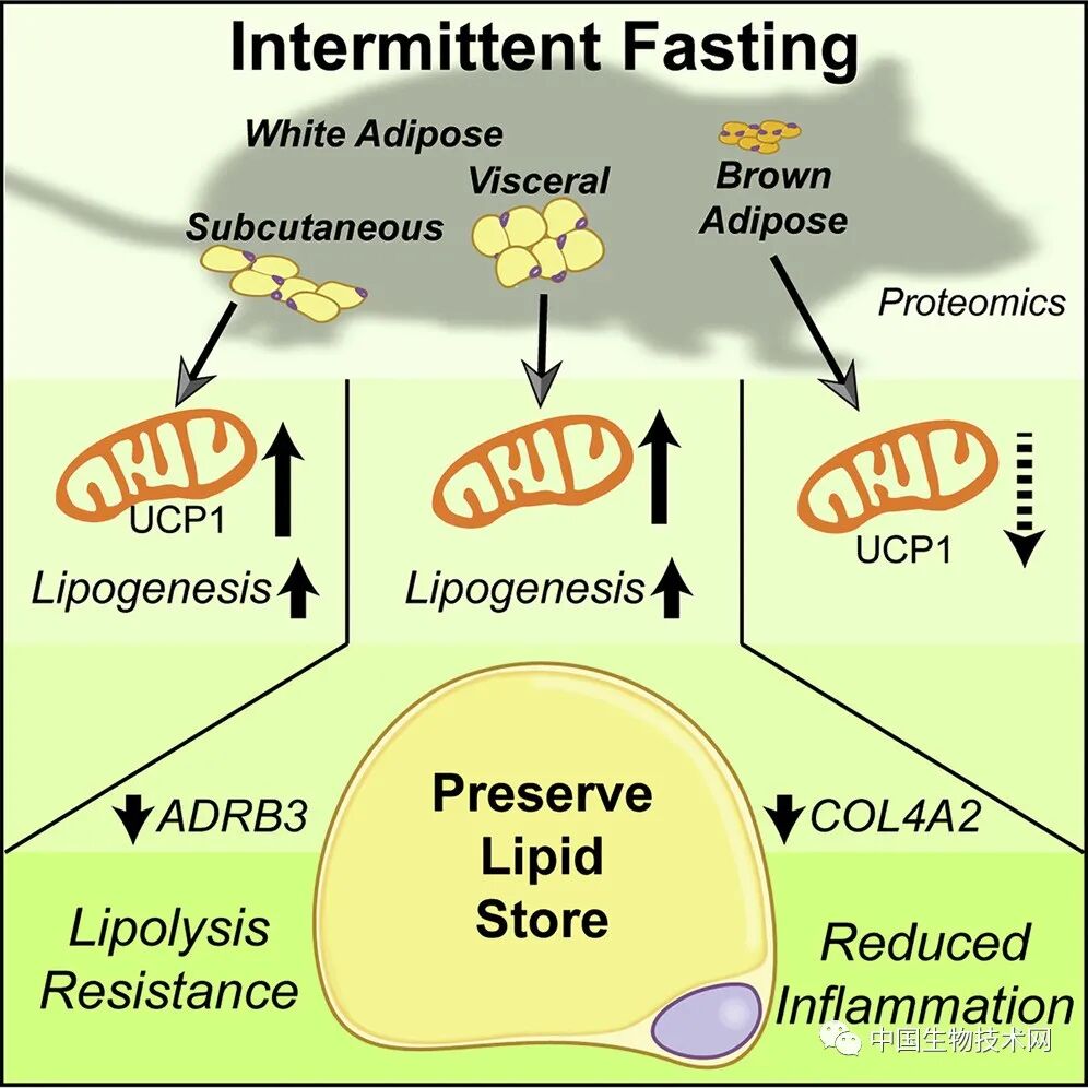 在禁食期间,脂肪组织通过释放游离脂肪酸向身体其他部位提供能量。与对照组小鼠相比较,隔日禁食的小鼠总食物摄入量出现轻微但不显著的减少,体重没有变化。如果隔日禁食持续时间延长,结果显示总食物摄入量的小幅减少,并导致总体重下降,这与其他研究的结果一致。然而,研究人员发现,隔日禁食将小鼠内脏脂肪和皮下脂肪的线粒体蛋白含量提高到相似的程度,却仅诱导了皮下脂肪中的解偶联蛋白1(UCP1)的表达。出乎意料的是,研究人员观察到,隔日禁食大大降低了内脏脂肪存储的脂解途径,相反,却增加了内脏脂肪和皮下脂肪中的脂肪酸合成途径。这些数据表明,在多次禁食期间,内脏脂肪可以显著且独特地改变脂质储存。