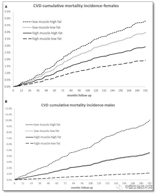 在这项研究中,研究人员分析了来自美国健康调查1999-2004年的数据,以及美国国家健康与营养检查调查心血管疾病死亡率1999-2014年的数据,总共涉及11463名20岁以上的参与者。研究人员将参与者分为四组:低肌肉量-低体脂组(对照组)、低肌肉量-高体脂组、高肌肉量-低体脂组和高肌肉量-高体脂组。然后,针对每一组的参与者计算心脏病相关的死亡率。
