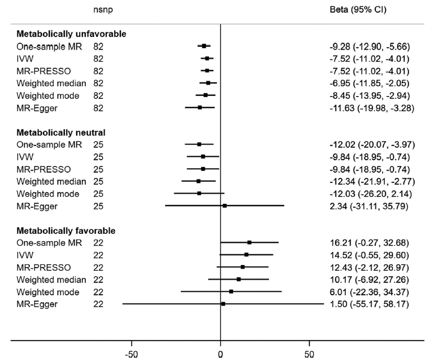 在这项研究中,研究人员调查了三种代谢不同的肥胖亚型,即:代谢不良肥胖(BMI和腰臀比同时增加)、代谢中性肥胖(仅BMI增加)和代谢良好肥胖(BMI增加、腰臀比下降)。