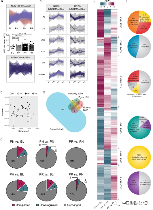 为了挑战这一范式,研究人员设计了一个实验模型,并结合多组学技术(转录组学、蛋白质组学和脂质组学)与生物化学和系统归一化相结合,发现了一个复杂且以前未被证明的不同优先级的线粒体适应网络。