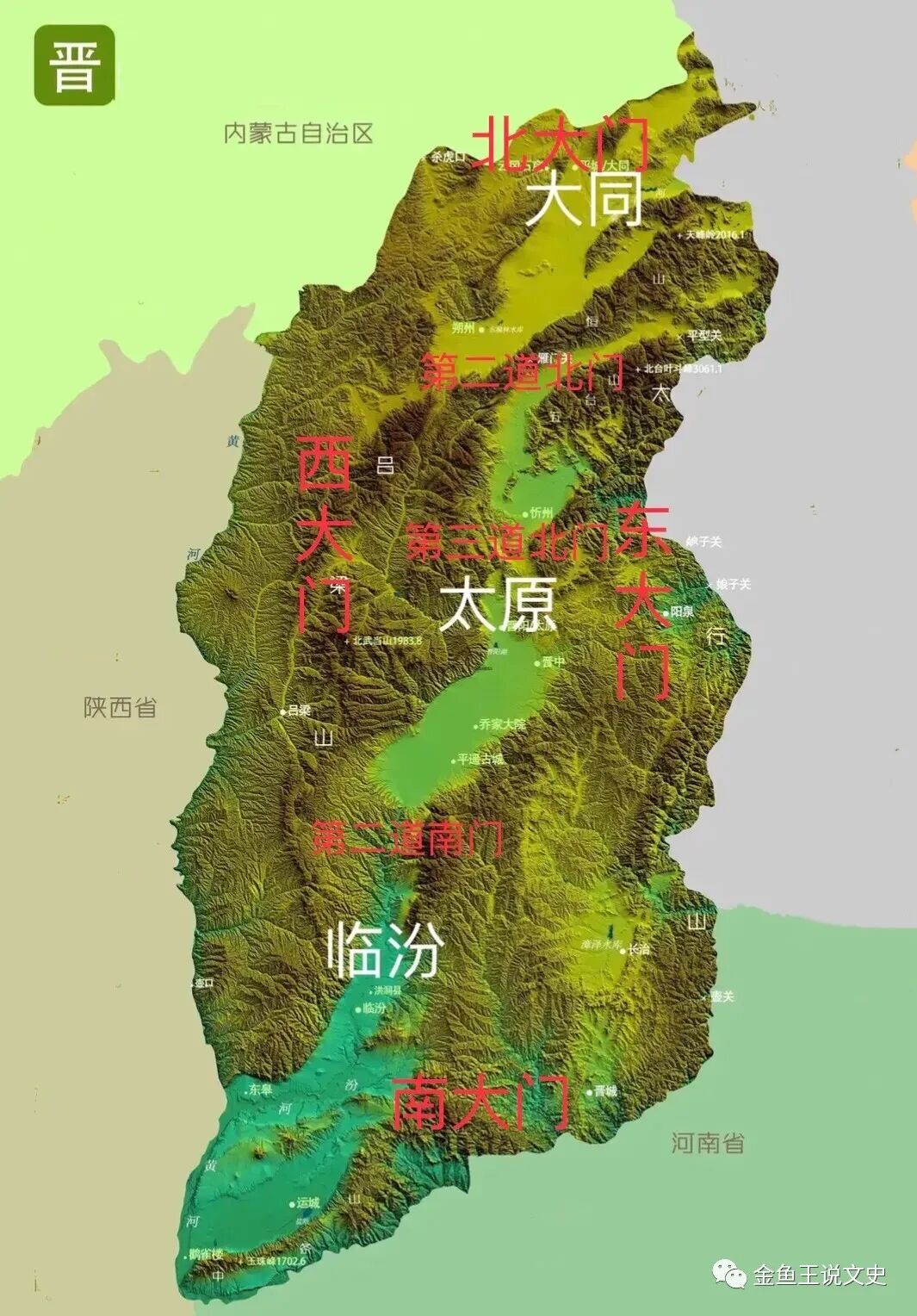 如果懂地理的朋友就会发现,山西南北长约680多公里,东西宽约380多公里,总面积15.63平方公里,其轮廓好像是一个由东向西南的平行四边形。这里绝大部分属于黄土高原,平均海拔在1000米~2000米之间。黄河在第二个拐弯处,由北向南,将山,陕西省分开。在抵达山西最南端之后,黄河开始转向,由西向东,又将山西和河南分开,再往南,王屋山构成了山西东南部的地理屏障。而整个山西东面则由太行山脉屏护~两座山,一条河,在地理上为山西提供了一个完整的防御带。