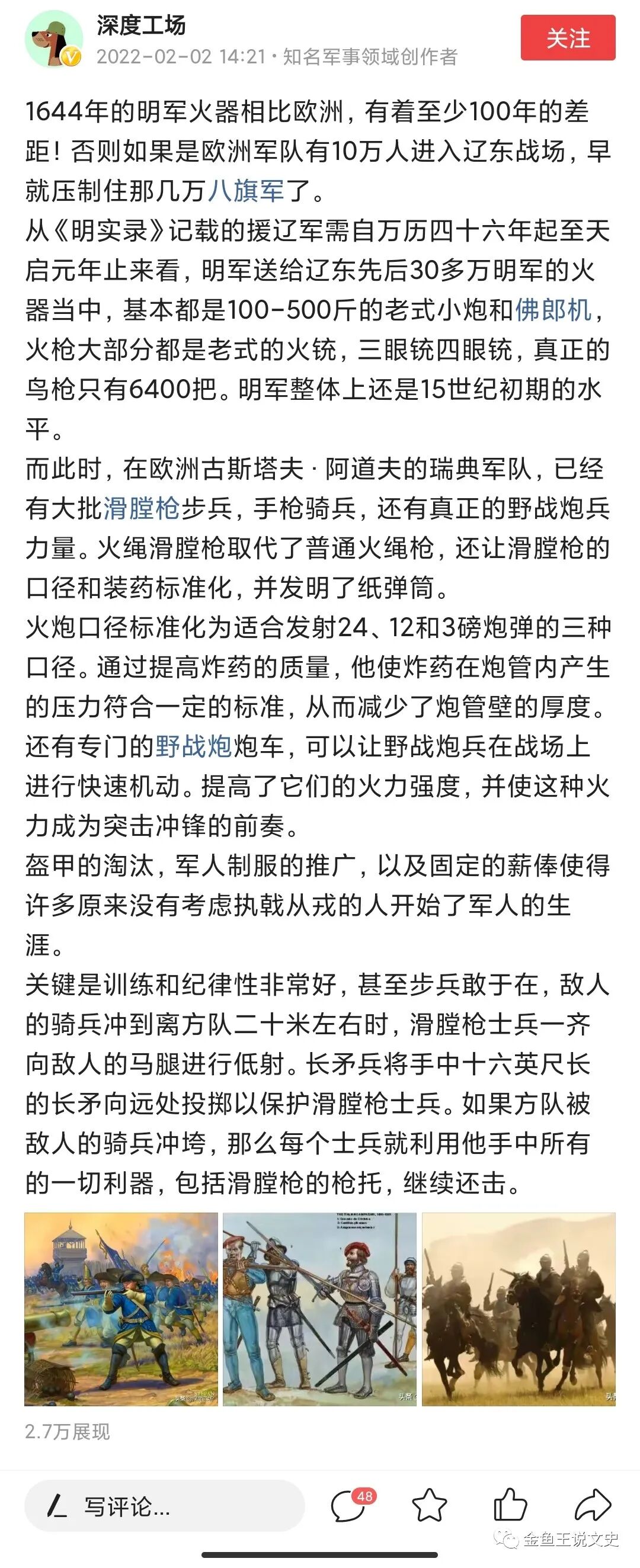 简直就是无稽之谈。看到一个大V的一个论述,真是把我吓了一跳。明朝火器技术在其后的发展中出现了波折,这个也是事实。你要说明朝的武器落后西方,我承认,但落后一百年,真敢开这口,现在的所谓的历史领域作者,都是张嘴就来吗?明朝火器要分开时间看,比如嘉靖年和万历年,明朝的武器变化非常大,万历年和崇祯年,武器相差更大,徐光启当初提出来研制或培养炮兵人才,不仅是从澳门购买火炮还聘请了炮师训练炮手,聘请了23名外籍炮师,工匠以及翻译等人员。最有名气的公沙的西劳,还有一个传教士陆若汉,他们随身携带了火器,有三门大铜铳,七门大铁铳,和三十支火绳枪,这些人来到北京训练,出了200多名炮手。徐光启又向崇祯进言,在培养几千人的火炮兵,可最后明朝由于没有钱,所以始终没有建成…