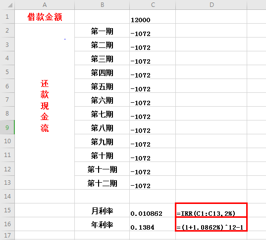 再教你一招功夫,IRR法宝不随身的时候也能用。估算大法——账面利息的两倍再减1。真实年利息=每月费率*12*2-1=0.6%*12*2-1=13.4%