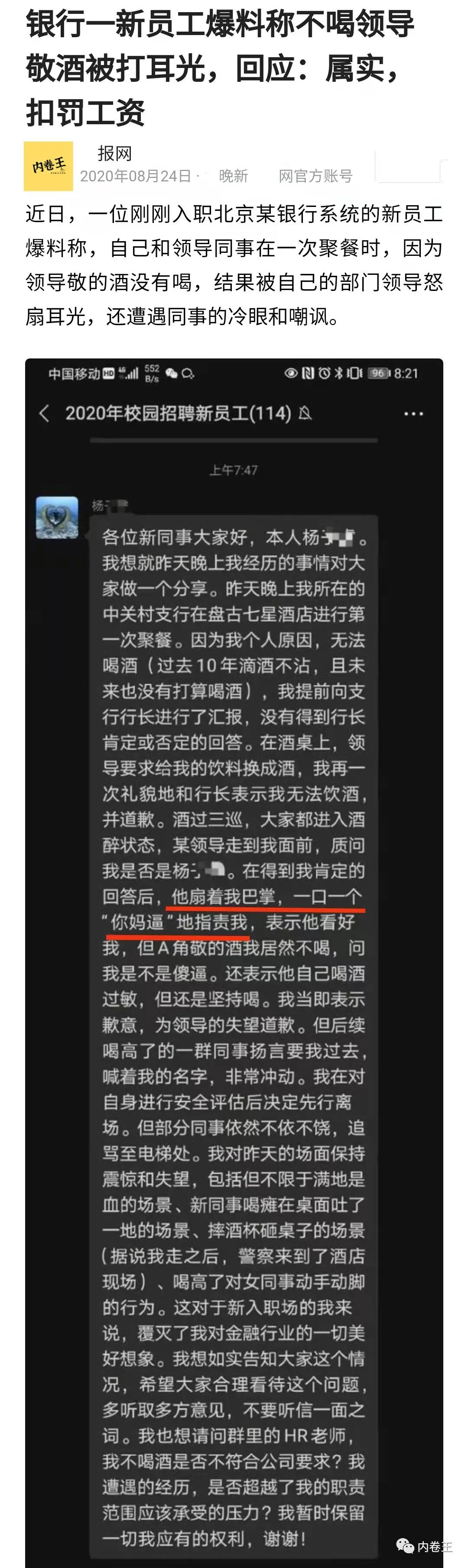 而我今天想说一则旧闻就是社畜被异化的具体体现,今天小编我去信用卡社摊,效果不理想,为了不至于晚上工作群报0,与旁边的厦门国际银行员工进行了信用卡互办。这个银行在我们长三角当地不多见,于是让我想起了去年的一条旧文,是关于应届毕业生入职厦门国际银行后不久,在员工聚餐上因为没有喝领导敬的酒,领导对着他就是一顿臭骂,还扇了他的耳光,不仅如此,还和另一个小领导一起追骂他到电梯口,不知道的还以为是原配追着小三跑呢。具体新闻如图,当时没听说过的可以搜来看一下。