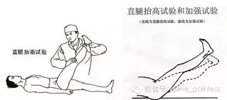 检查方法:患者双下肢伸直仰卧,检查者一手扶住患者膝部使其膝关节伸直,另一手握住踝部并徐徐将之抬高,直至患者产生下肢放射痛为止,记录下此时下肢与床面的角度,即为直腿抬高角度。正常人一般可达80度左右,且无放射痛。在此基础上可以进行直腿抬高加强试验,即检查者将患者下肢抬高到最大限度后,放下约10度左右,在患者不注意时,突然将足背屈,若能引起下肢放射痛即为阳性。
