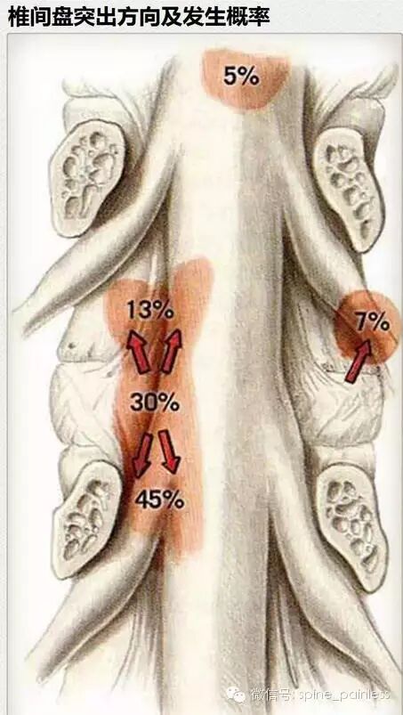 根据突出的方向与受压神经的关系分型:(1)中央型:突出部分位于椎管中央;(2)中央旁型:突出部分位于椎管中央旁;(3)椎间孔型:压迫鞘内神经根与神经节。