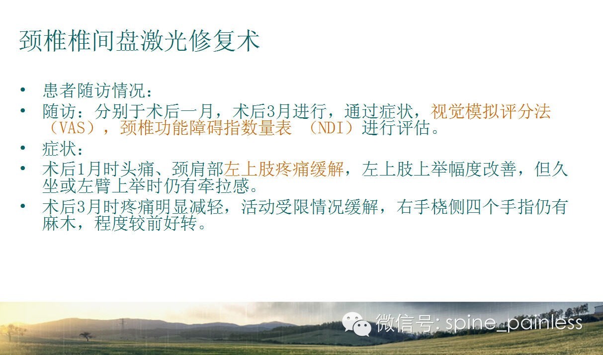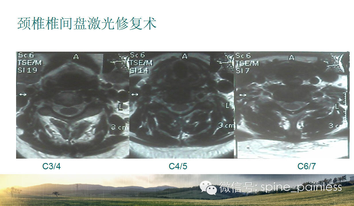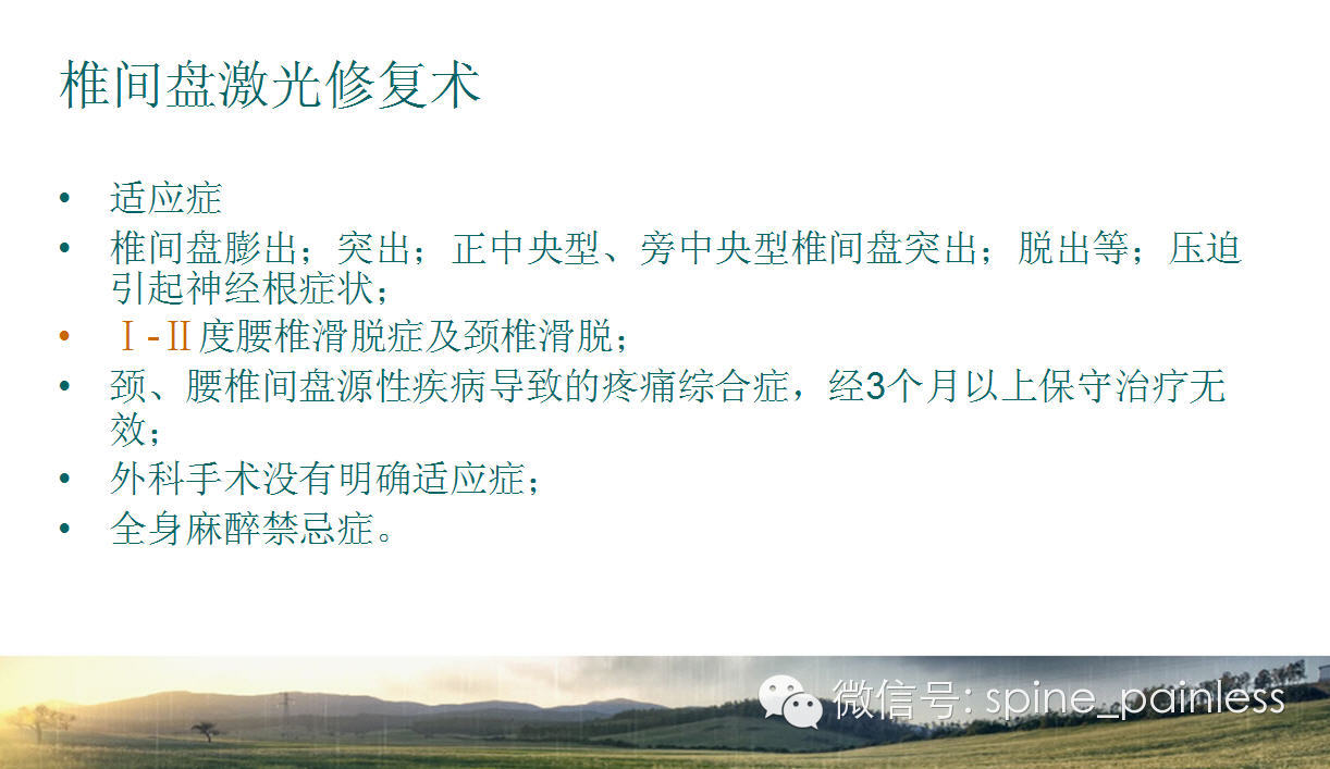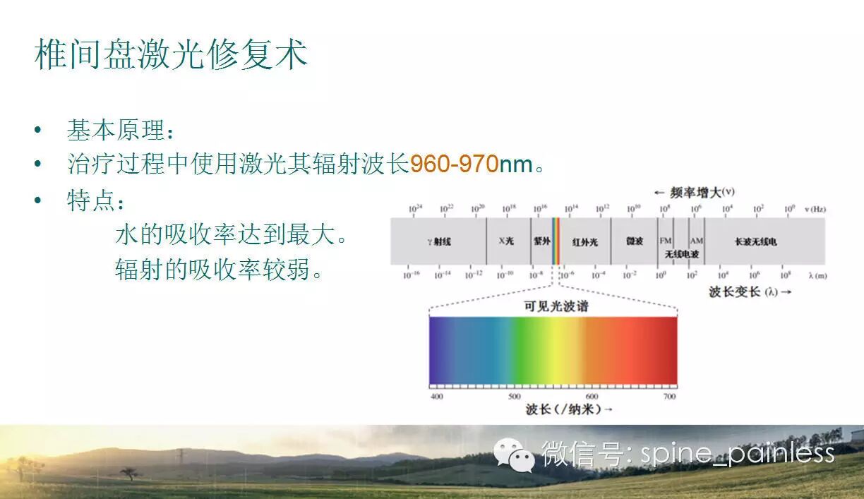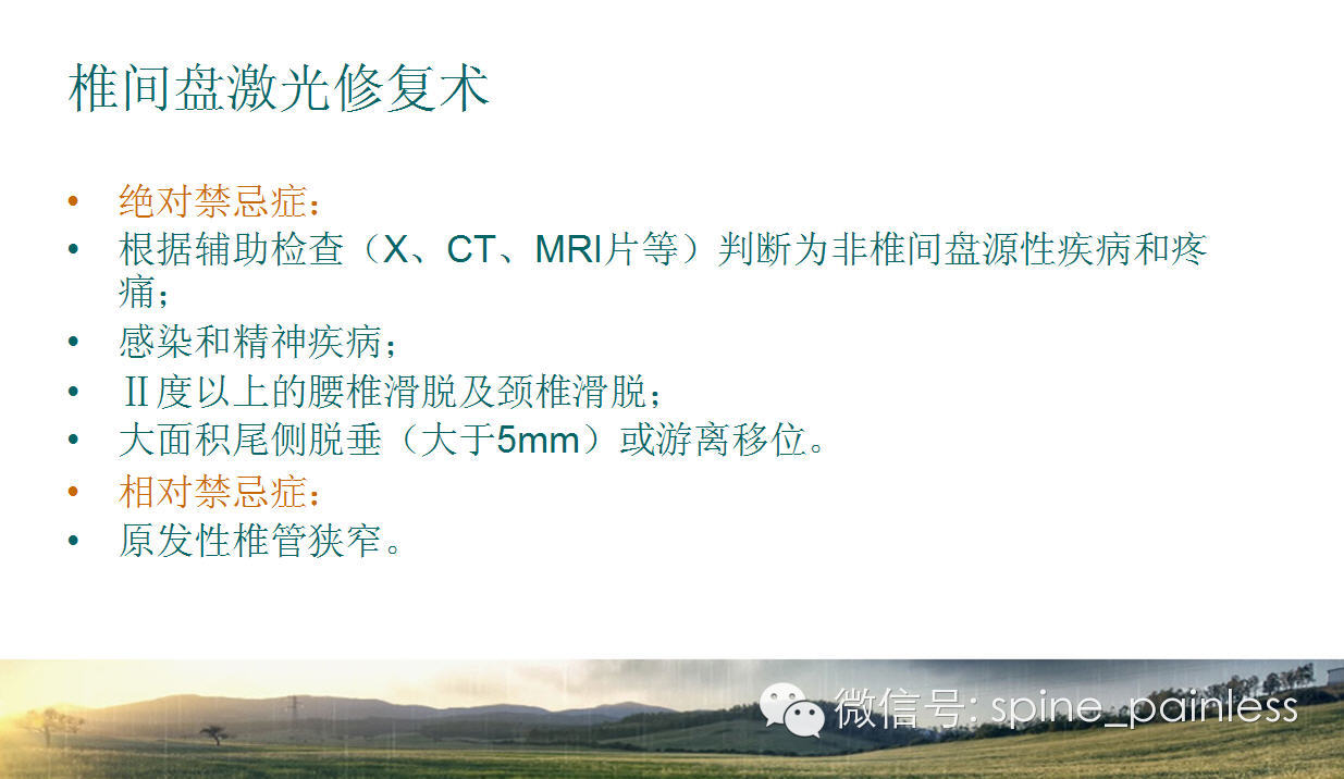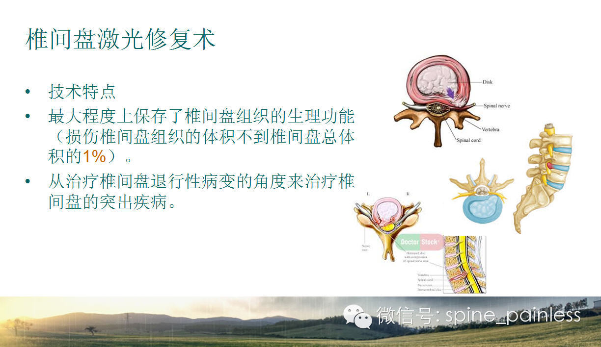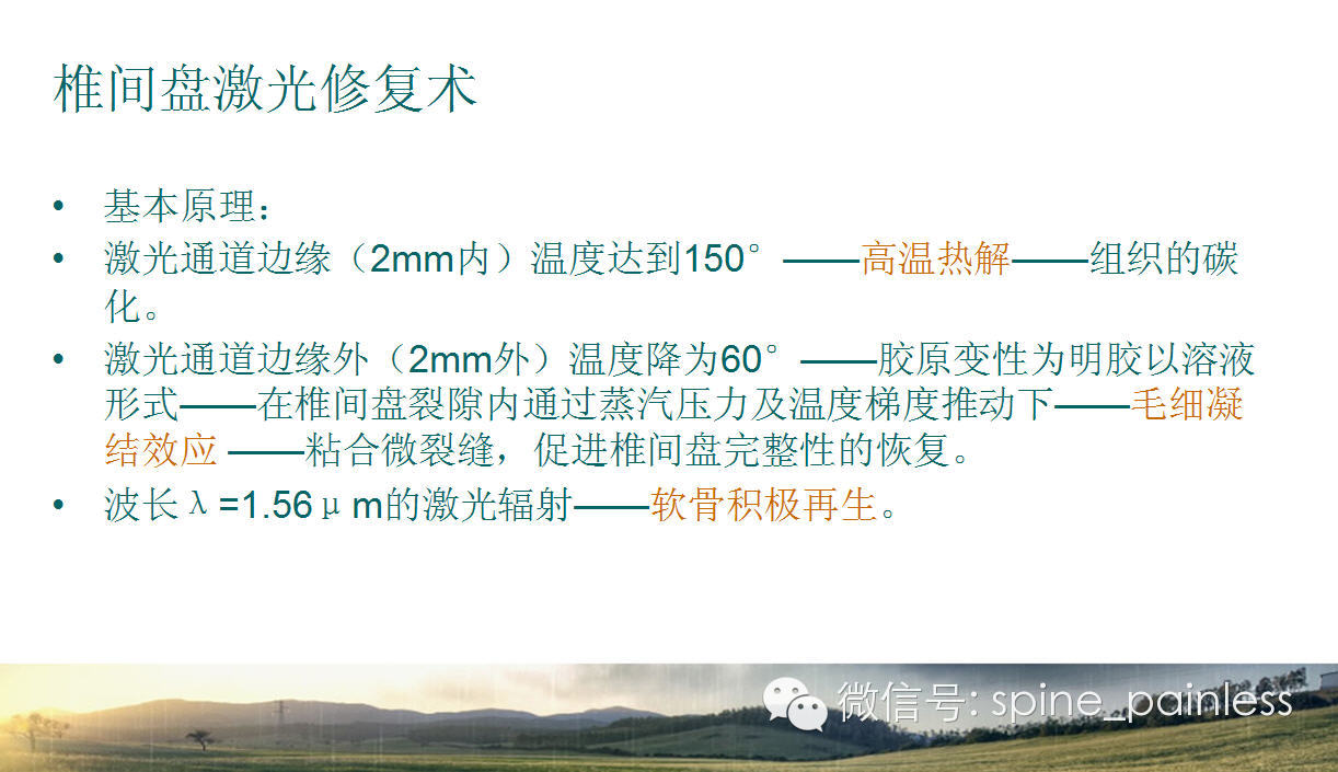 •激光通道边缘(2mm内)温度达到150°——高温热解——组织的碳化。•激光通道边缘外(2mm外)温度降为60°——胶原变性为明胶以溶液形式——在椎间盘裂隙内通过蒸汽压力及温度梯度推动下——毛细凝结效应——粘合微裂缝,促进椎间盘完整性的恢复。