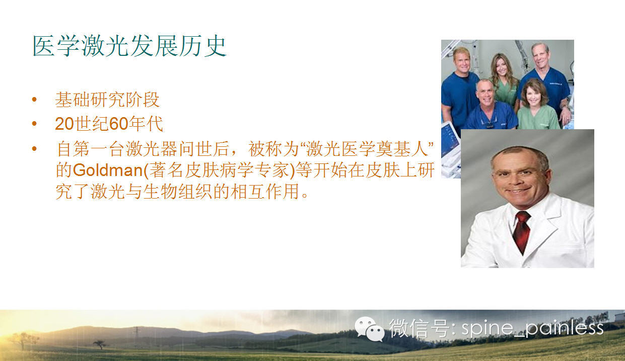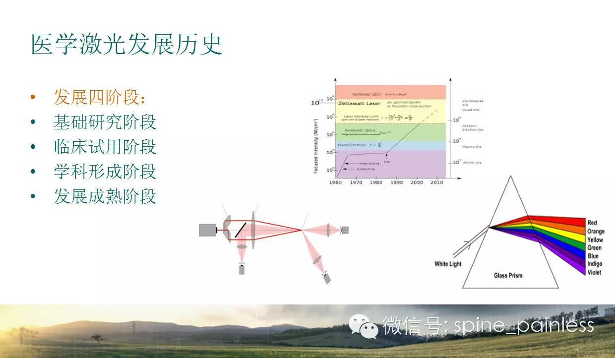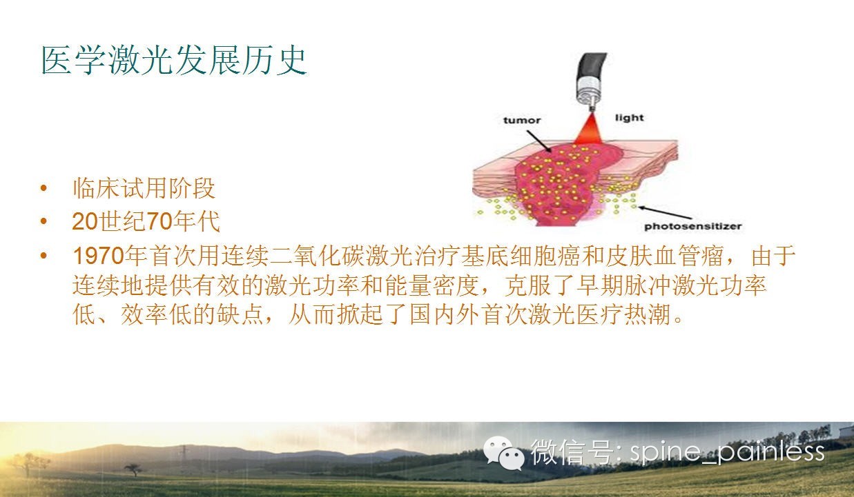 •90年代起,医用激光器与电子计算机、纤维内镜、图象分析、摄像录像、荧光光谱、X线和超声等新技术不断结合,使医用激光器朝着高性能、智能化、微型化及专科化方向发展。