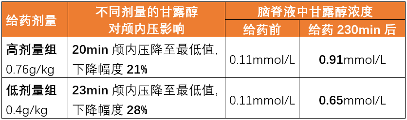 甘露醇低剂量组的降低颅内压作用与高剂量组相当,但高剂量组的降压速度更快,脑脊液中甘露醇浓度更高,颅内压反跳更严重。