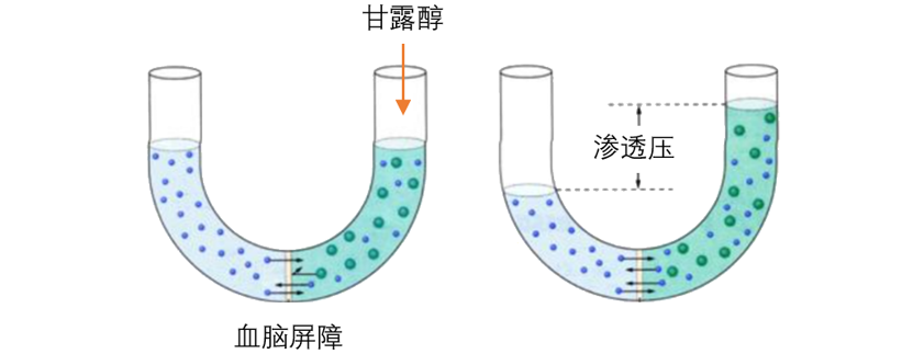 静脉输入甘露醇后,血浆渗透压迅速升高,使水分从脑、眼等周围组织中转移到血循环,从而降低颅内压、脑脊液容量和眼内压。
