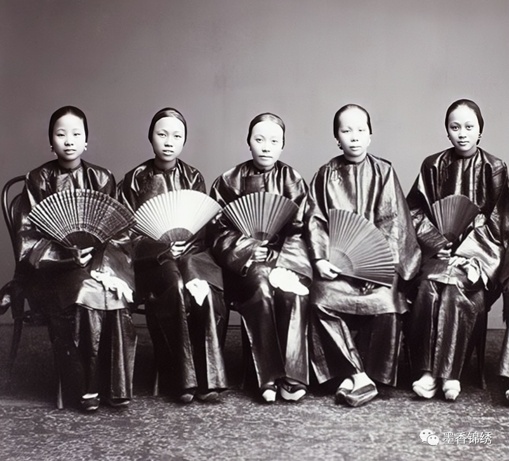 晚清1890年一群年轻的客家女子在照相馆内的合影旧照,众所周知晚清时期民间女子缠布裹足之风尤为盛行,而彼时唯有东南沿海一带的客家女子无需缠足。而这张老照片中的女子皆是天足,根据其穿着打扮来看,便是当时沿海地区的客家女眷。
