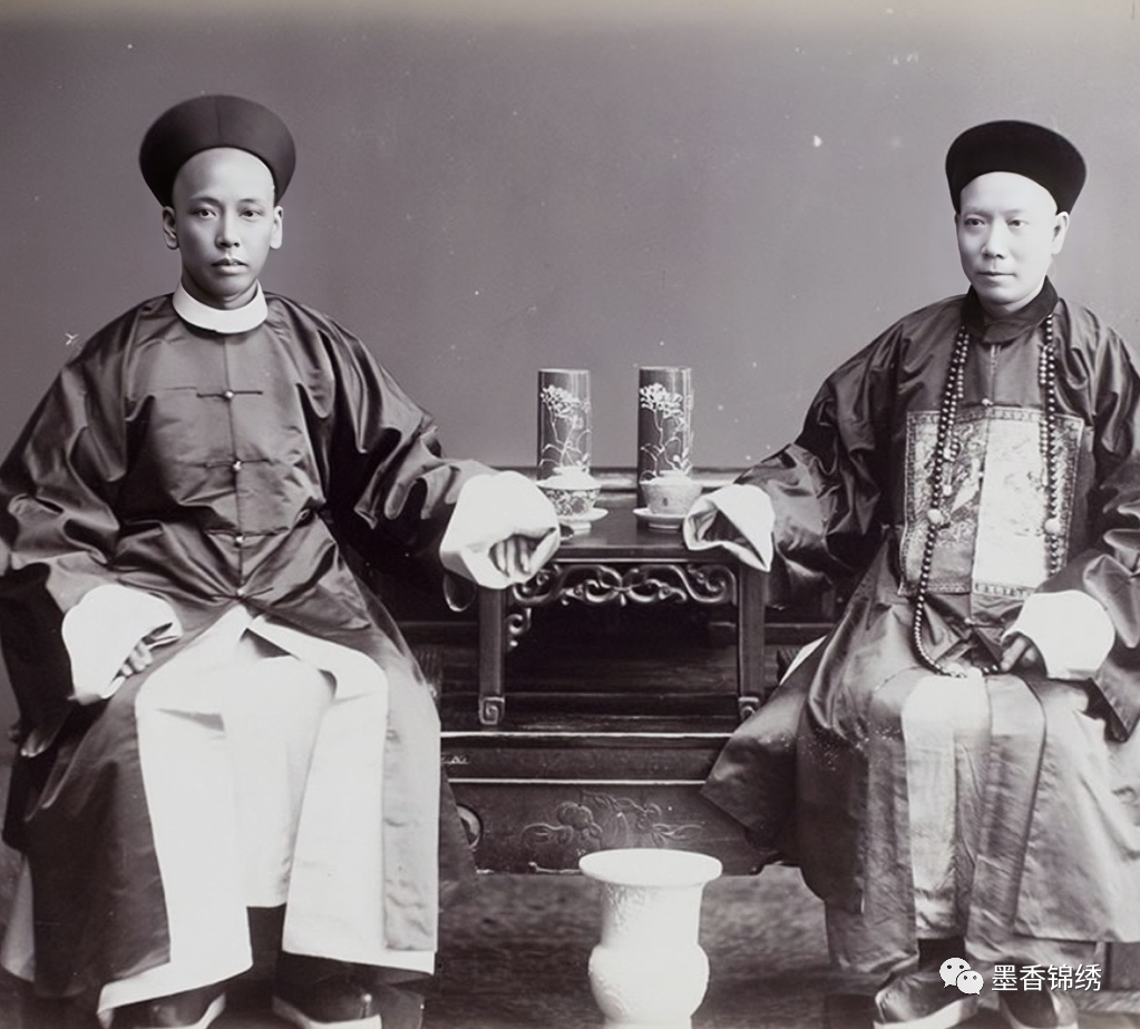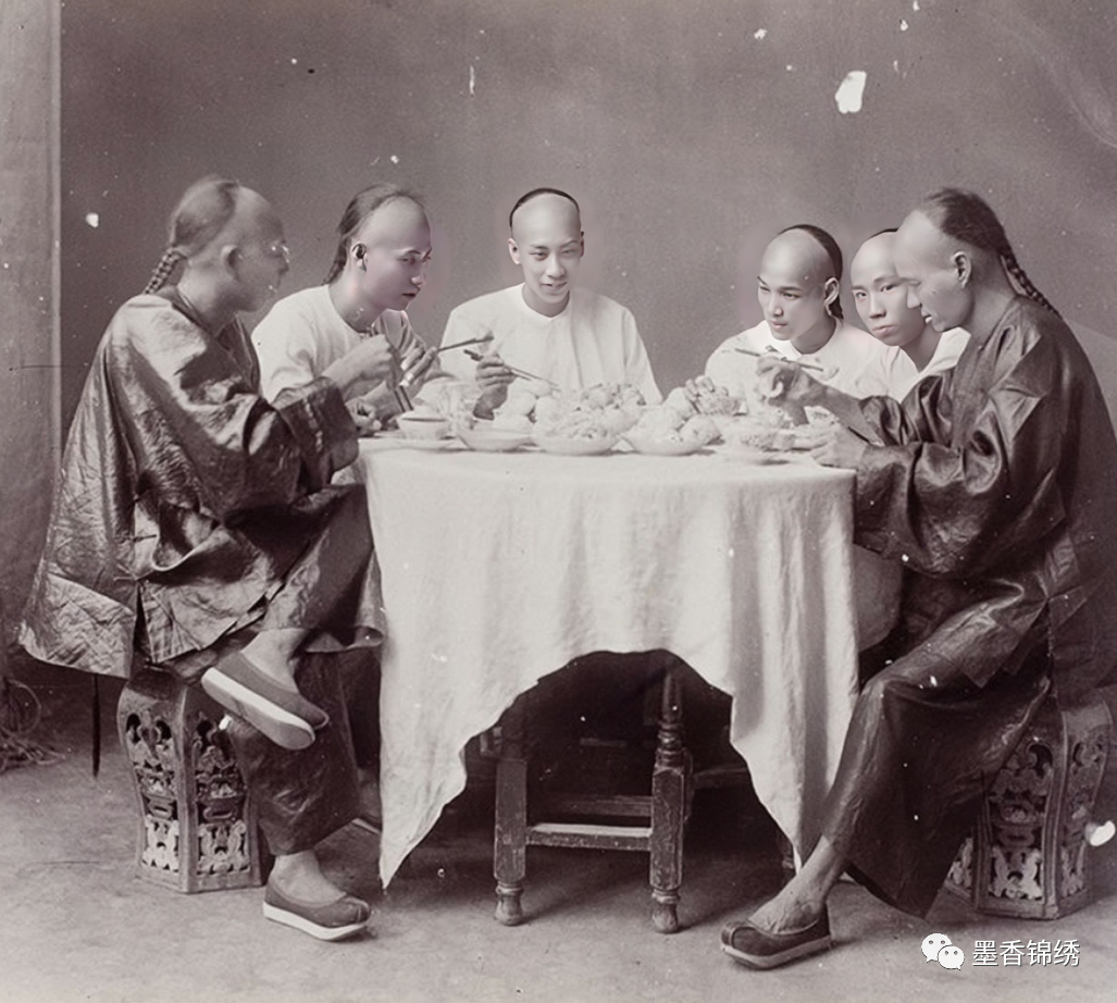 晚清年间的大户人家男子正在吃饭时候的留影旧照,老照片中的男子发型与清朝的宫廷剧中装扮还算相似,只是其具体细节仍旧可以看到有些许不同。清宫剧中的男子发型皆是剃光了前额,而真实的晚清时期的男子则更加注重前额与耳后之处的头发剃光,只留下后脑勺一处作为编长辫子。