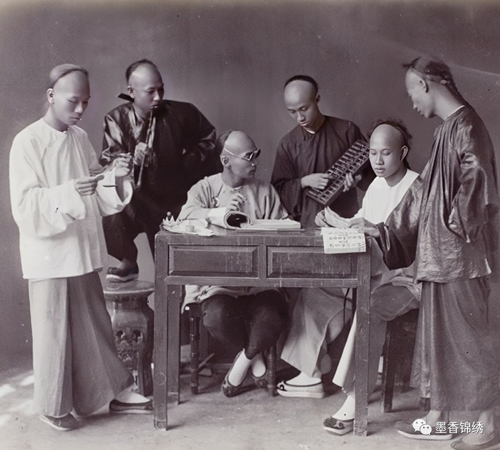 晚清年间一家店铺里的掌柜与店小二核对账目时候的旧照,古时候人们计算数字账目皆是用算盘,正所谓心里有事好盘算,一把算盘走天下,可见这算盘在科技不发达的古代有着多么重要的价值与地位。
