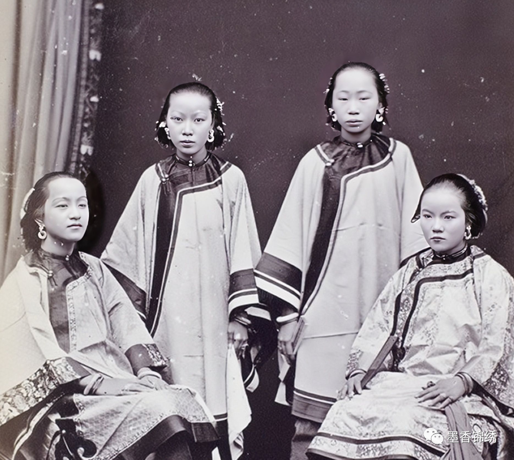 晚清年间四位旗人女子穿裙袄时美丽端正的留影老照片,其实旗人女子的裙袄服饰乃是延续了明朝时期女装式样的改良。熟知汉服历史的文者可以研究一二,便知此类服饰乃是汉服一路演变而来的终极形态。而晚清时期的男子则非传统式样,与女子的着装更是有着天壤之别。