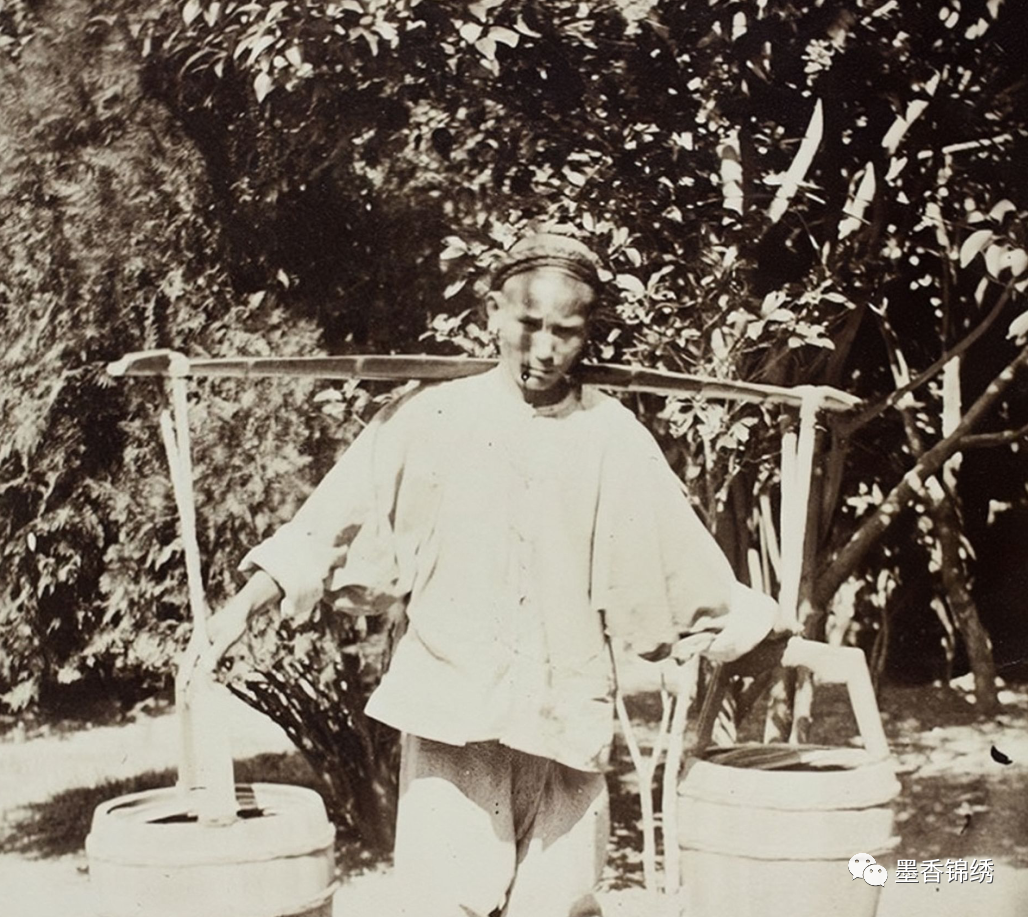 晚清1858年的工人在园林里挑水时候的留影老照片,彼时的百姓家中尚没有余钱打井,其吃穿用水皆是从公用处置办,或许花钱请人送水而来,生活起来十分的繁琐不便。这些珍贵的老照片记录了百年前上海的人文风情,亦是为研究历史的学者们提供了具有极高价值的影像资料。