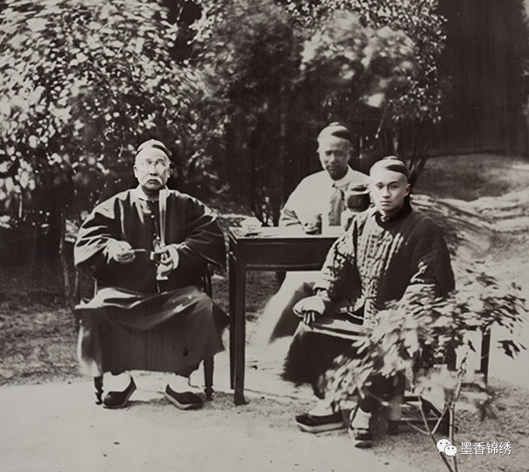 晚清1859年间苏州一家钱庄里的老板与友人们在后院花园里品茗喝茶旧照,彼时正处于太平天国之战时期,清廷曾派人在曹家渡修建前往梵皇度之路,而且经由苏州河为军队运输粮草。后来于晚清1861年,清军设立的曹家渡被公共租界管制。
