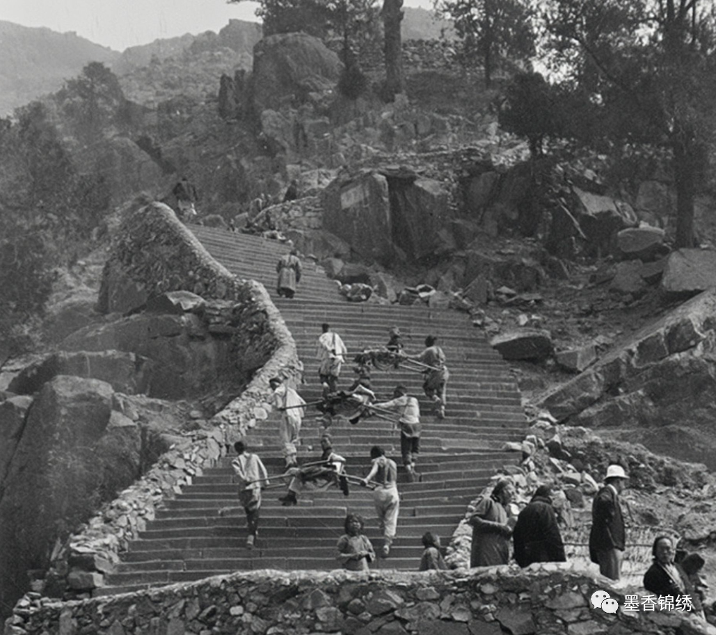 晚清年间游客们坐小轿子登泰山时候的留影旧照,虽然彼时的百姓们对旅游一词还没有什么概念计划,但是每年到泰山之顶观光和祈祷的人却是络绎不绝。据悉在泰山上有许多寺庙道观,信奉香火的百姓们总会徒步上山拜佛,以祈求心中所想能如愿。