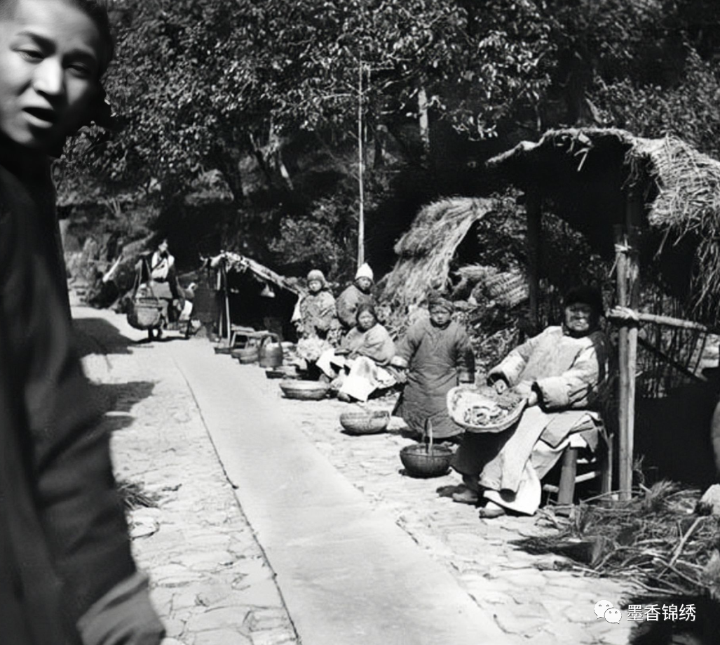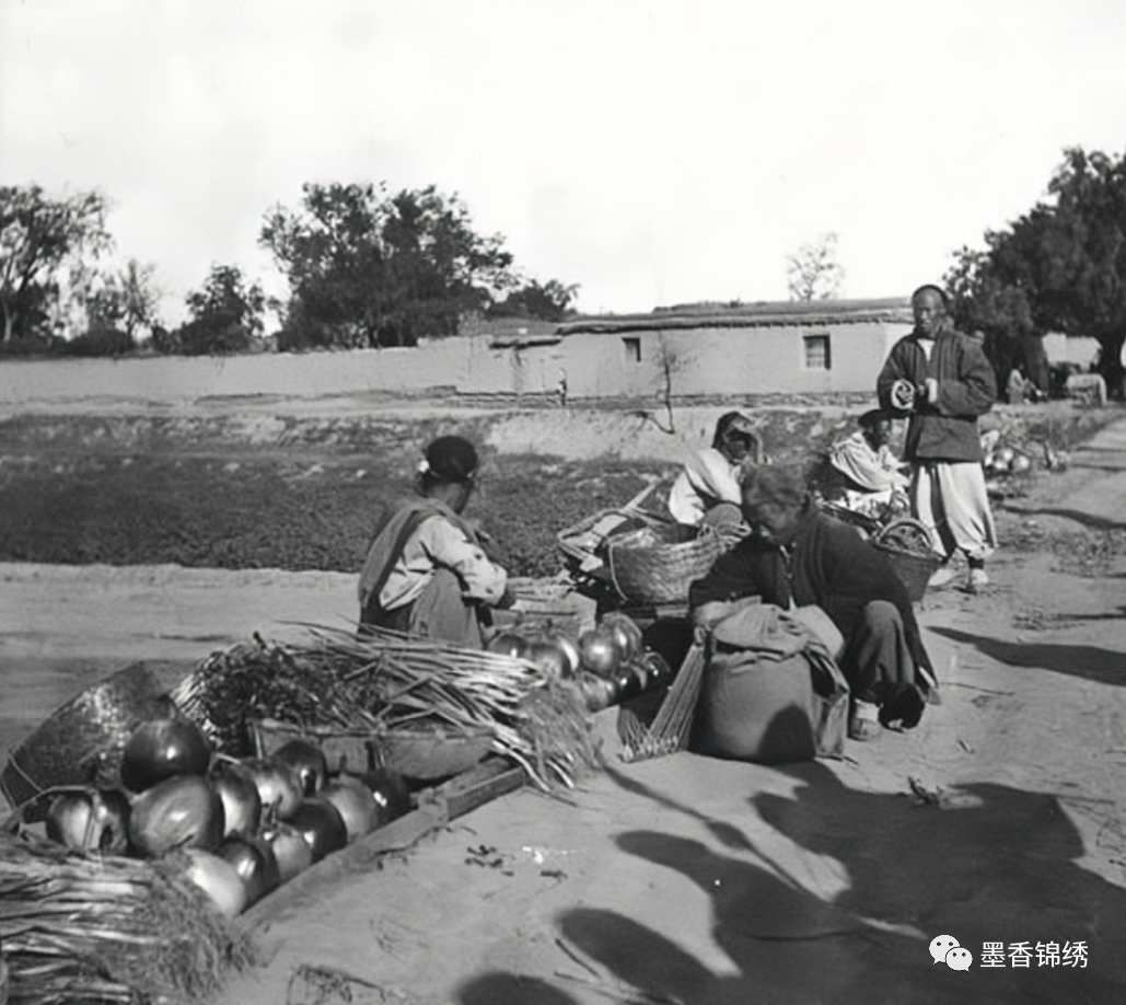 晚清年间河北当地的清河旧照,老照片中有小贩在路边卖蔬菜瓜果,沿路亦是有行人驻足停下围观。从老照片中细细来看,不难看出小贩的摊前有新鲜的大葱与西瓜,那大葱上带着的泥土气息,即便是时隔了百余年的光阴历史,却仍旧能感受到其中清新扑鼻的农家气息。